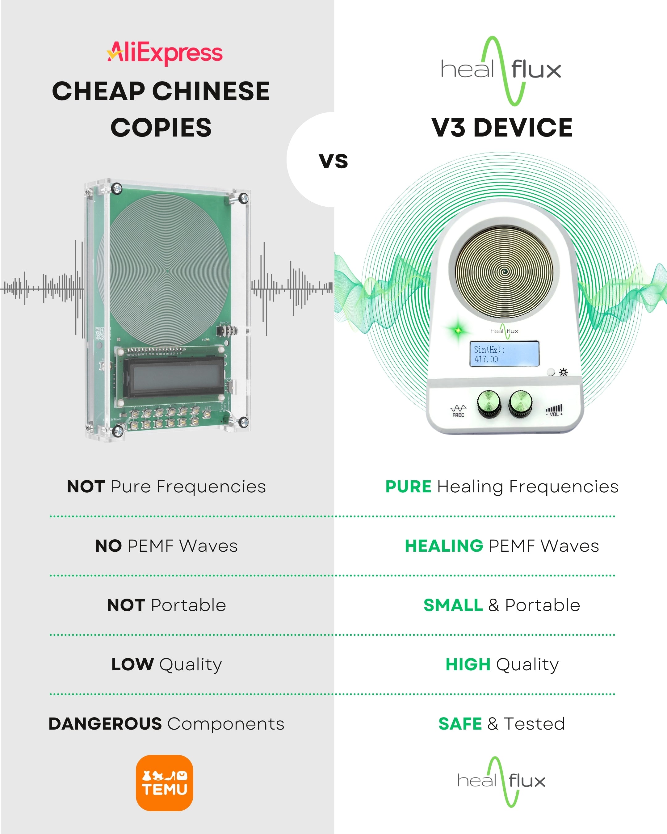Many low-cost frequency devices from other websites and from Amazon and eBay all come from Aliexpress (China). These devices do not generate pure frequencies or scalar PEMF waves. You will see that all of these other devices look the same and is due to the fact that they are mass-produced copies from China. Healflux devices are the result of collaboration between an international team of electronics engineers, technical designers, software developers, and frequency practitioners. Each of our devices are rigorously tested to ensure they produce only the purest and most accurate frequencies.