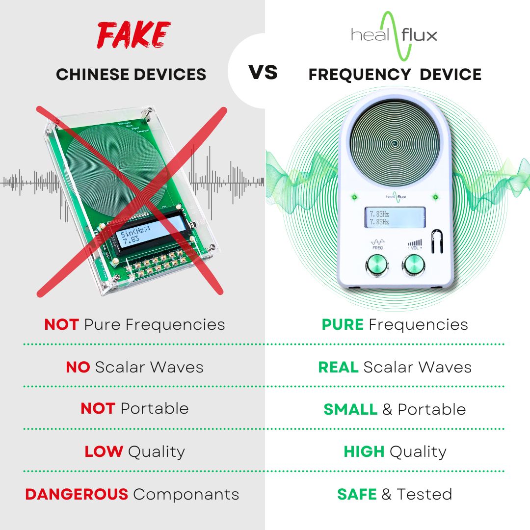 Many low-cost frequency devices from other websites and from Amazon and eBay all come from Aliexpress (China). These devices do not generate pure frequencies or Scalar Waves. You will see that all of these other devices look the same and is due to the fact that they are mass-produced copies from China. Healflux devices are the result of collaboration between an international team of electronics engineers, technical designers, software developers, and frequency practitioners. Each of our devices are rigorously tested to ensure they produce only the purest and most accurate frequencies.