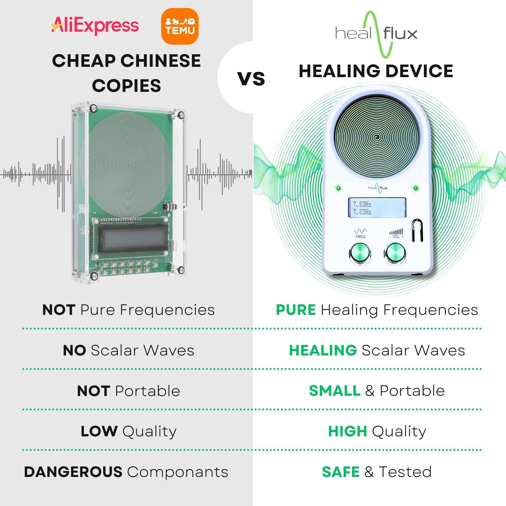 Many low-cost frequency devices from other websites and from Amazon and eBay all come from Aliexpress (China). These devices do not generate pure frequencies or scalar waves. You will see that all of these other devices look the same and is due to the fact that they are mass-produced copies from China. Healflux devices are the result of collaboration between an international team of electronics engineers, technical designers, software developers, and frequency practitioners. Each of our devices are rigorously tested to ensure they produce only the purest and most accurate frequencies.